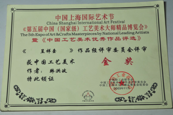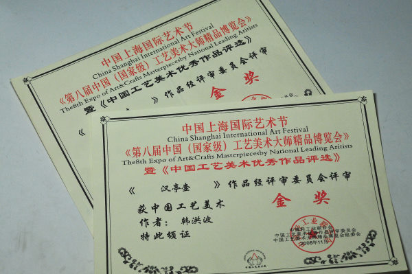 自從韓所長的作品獲選入藏【中國國家博物館】、【中國宜興陶瓷博物館】、【無錫博物館】等博物館單位後...;2003年作品“九頭錦昉茶具”參加由【浙江省文化廳暨浙江省文化藝術界聯合會 】聯合主辦的《第三屆國際民間手工藝品展覽》榮獲金獎;2003年11月韓洪波所長再以作品《呈祥壺》參加由中國工藝美術學會主辦的“第五屆中國工藝美術大師精品博覽會”榮獲金獎後...,韓洪波所長竟再於2006年以作品《祺祥壺》及《漢亭壺》參加由中國工藝美術學會主辦的“第八屆中國工藝美術大師精品博覽會”,二件作品雙雙同時榮獲金獎。 (註:這最後參展的二件得獎作品,這麼多年下來,竟從來未曾開口與老麻瓜提及過!)
