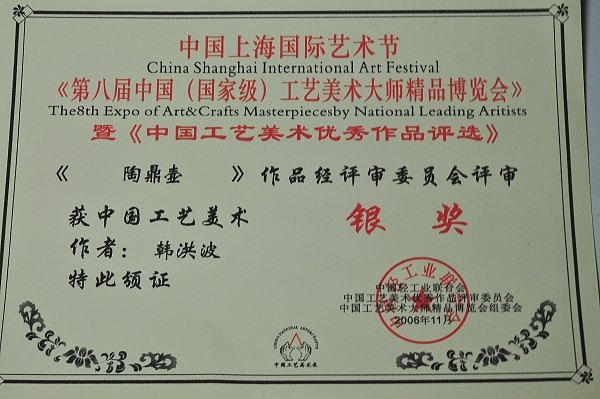 另,韓洪波所長的“陶鼎壺”,在“第八屆中國工藝美術大師精品博覽會”獲得“銀獎”,因之前韓所長從未提及此獎,故老麻瓜也從來不知,直至老麻瓜發現夾在證書裡頭的這一張未曝光的“銀獎”,韓老大始提及,真是客氣的可以了。