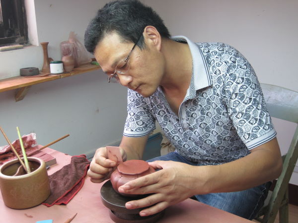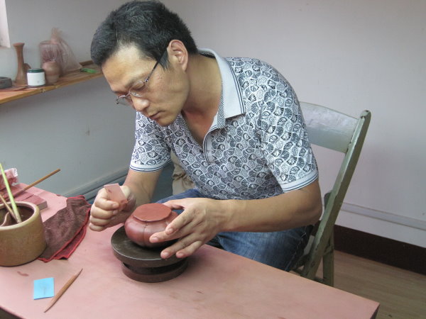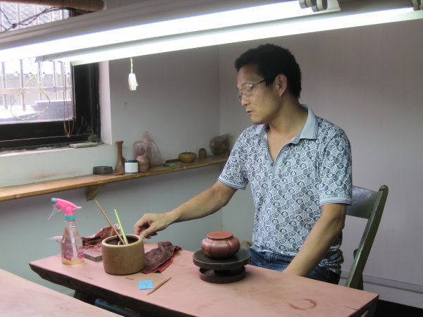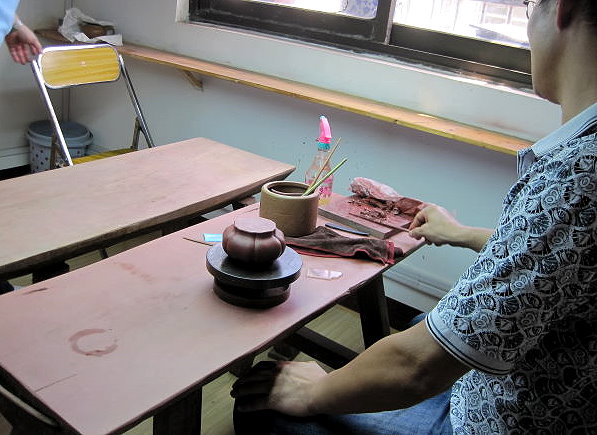 只見工作桌前,許仲老師神色莊嚴,一份凝重而具大將之風的氣勢油然而生...,原本內向而靦腆的神色一掃而光,製壺時自信的神韻勁兒,真教人大開眼界...。