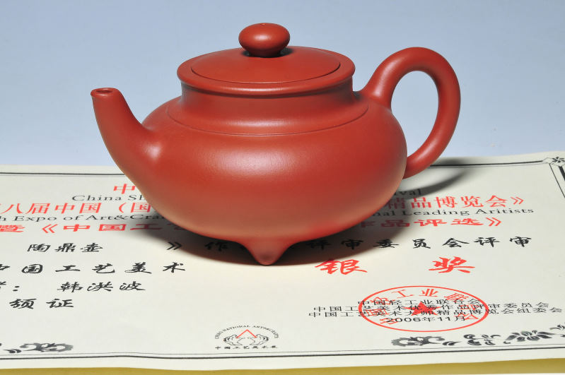 圖為:2006年11月韓洪波所長的作品《陶鼎壺》參加由中國工藝美術學會主辦的“第八屆中國工藝美術大師精品博覽會”,榮獲銀獎。