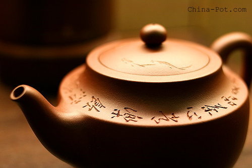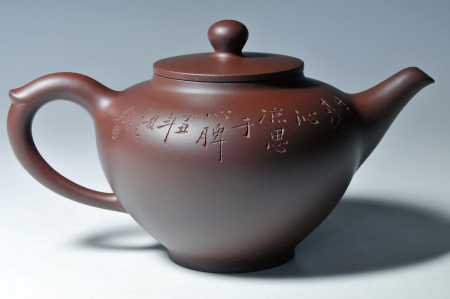 圖為:《周潔萍手製•新樂壺a(反面鐫刻特寫)~紫茄泥》