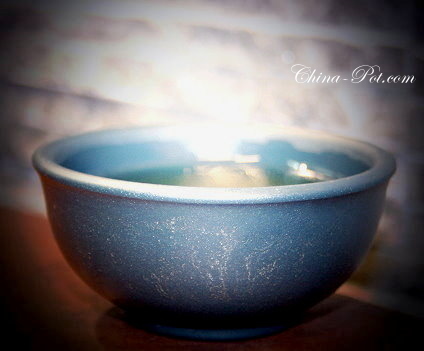 這窯變金葵黃碰水後,胎表上沾了水氣的金黃色熟料砂會隱隱若現、
