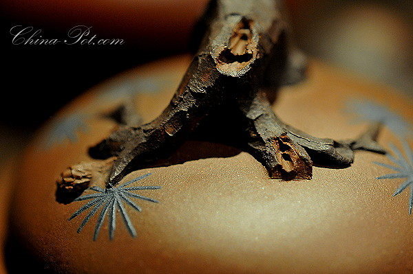 從這張圖片,可以看出高深的造工技藝....,用全手工堆砌出巧奪天工的松幹、松針及松果等引人入勝的老辣質感,就是讓人驚豔的頂尖貼花製壺技巧....