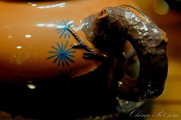 為了重心分配,薄胎壺的壺把通常都要淘空,作者將淘空壺把後留下的通氣孔,巧妙地融入裝飾樹幹的裂紋中,真是一絕。