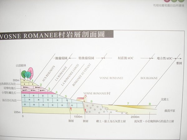 第一段,能說明同是在高峰種的茶,坡地的礫石與谷地的黏土較多的地方,味道是差在“口感較強勁豐富”與“細膩的變化”。(看了附圖:“丘夜區-VOSNE ROMANEE村岩層剖面圖”中酒莊品級分布圖後,好像法國佬比較喜歡“細膩的變化”喔!)