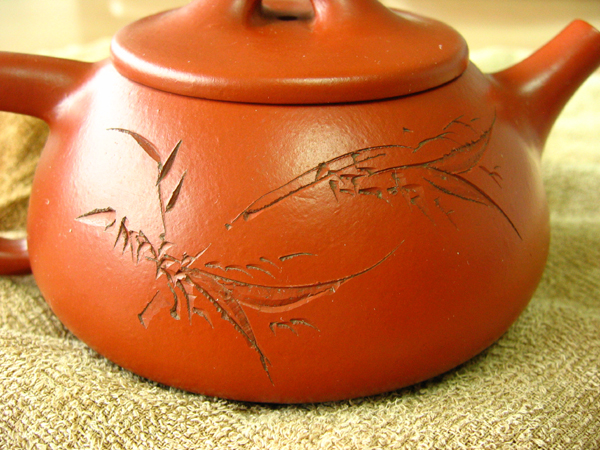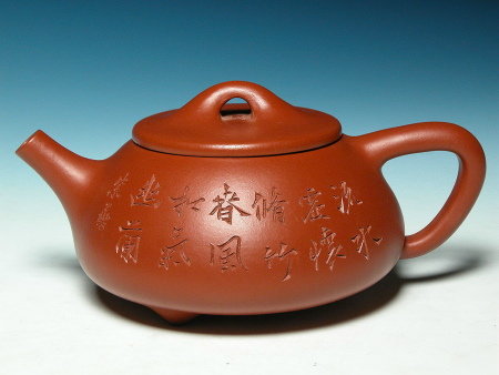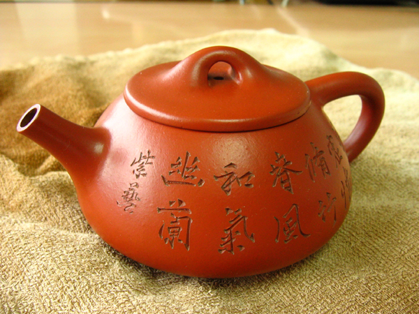 這把嫩大紅袍石瓢壺•壺身、壺底、皆有刻三刀的字句。壺身比例完美、容量也正好符合我們在真壺泡茶時的需求。真夠我們喝了••之前都擺在櫃中沒注意到它、卻忽然發現這塊泥料的包漿之色很有嫩蜜瑰紅的感覺、熱水沖淋後、水色更加明顯動人、、《不知道有哪位會員朋友有養成後的嫩大紅袍照片嗎?很想看〝〝成品〞〞吶••》