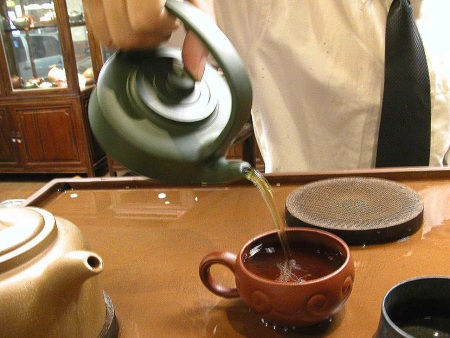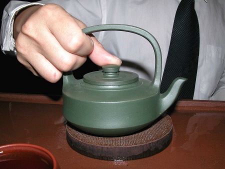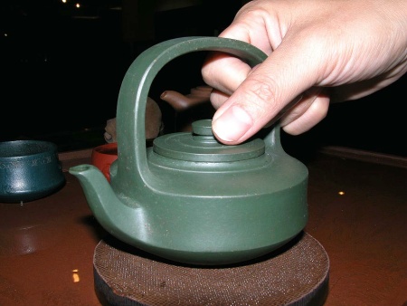與一般使用的壺、執壺方式相去不遠,兩指《或三指,依各人習慣而定》勾入提把『近壺身』處《不要握於提樑中央》,大姆指按壓於壺鈕即可。
