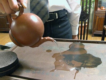 將壺倒過來的一瞬間,因極大部份的茶湯或水是盛在壺內,所以只有極少數管內殘餘的水會由壺底滴下。