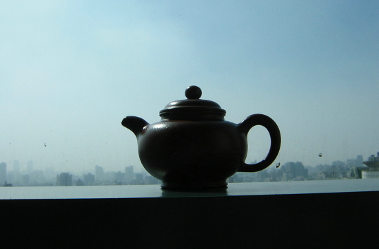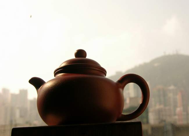 背景是台中市,17樓,早上10時...陽光透過玻璃照在壺上..