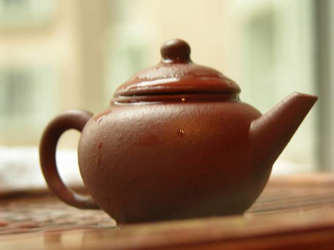 100度C滾水淋在結霜的朱翠(砂多漿少)二杯水平壺上。