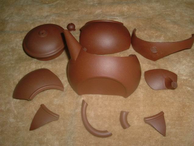 我的房間裡面對電腦而言,電視在電腦的右側,床在後方,壺保養完畢後,我便轉身將它置於床上,此時弟弟正側躺在床上看著康康的白爛綜藝節目,來賓是陳昭榮,印象中玩什麼不能說「你、我、他」的遊戲,或許是忽然出現一個很好笑的片段,弟弟忽然狂笑,狂笑不打緊竟加翻滾,翻滾不打緊居然動到棉被,動到棉被不打緊但棉被居然掃到我的壺,棉被掃到壺不打緊該死的是壺居然被掃到了地上,聽見了後方傳來清脆響亮的破碎聲我跟著慘叫,就這樣我的第一支壺從到手到掛點還不到半個月時間,我連為它照張生日照都還來不及照...在此提醒各位壺友凡事謹慎,雖然它並不很名貴但卻是我茶道生涯的「the first」,還是令人覺得心痛,僅以此文致上哀悼之意...