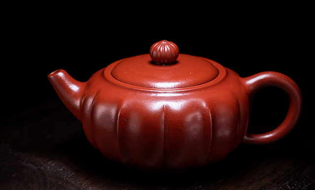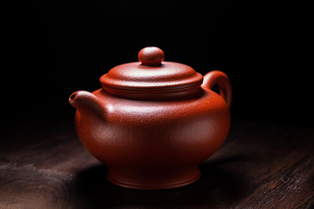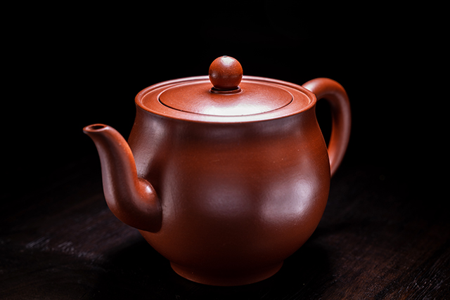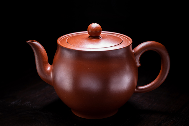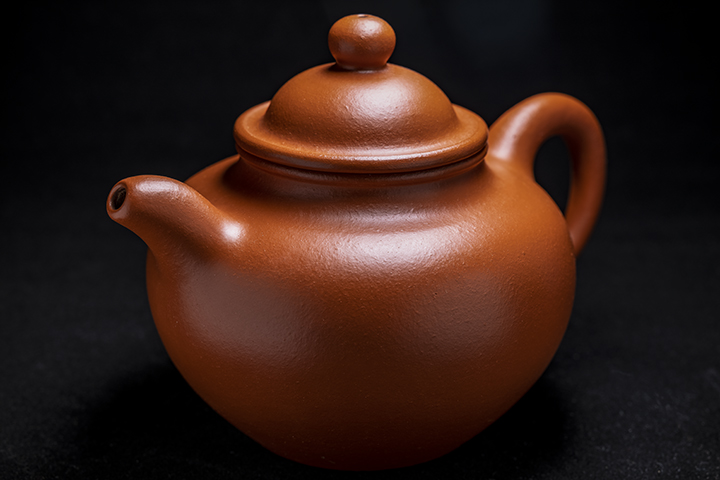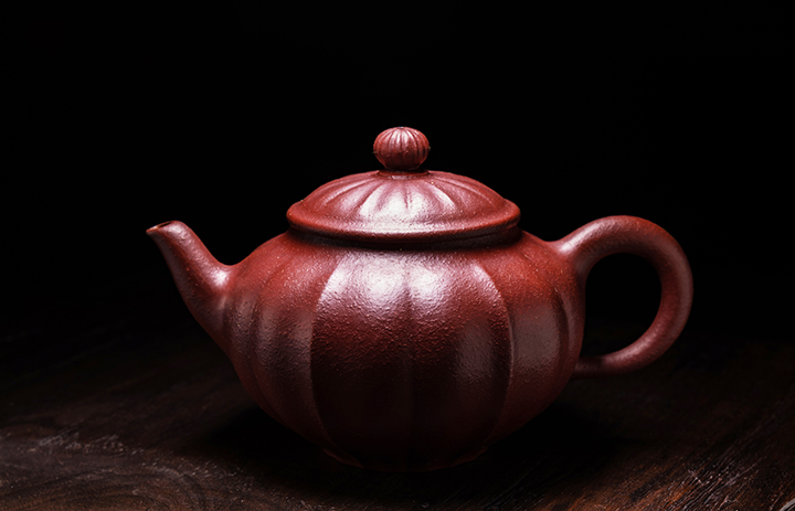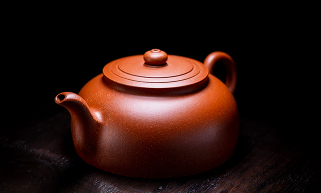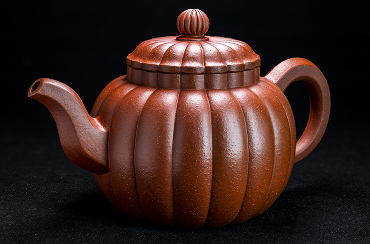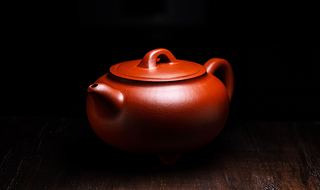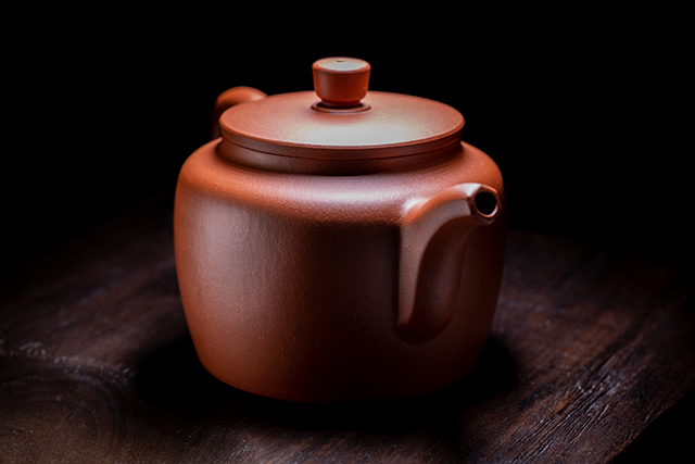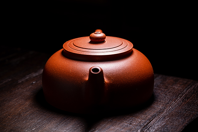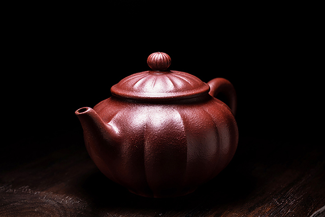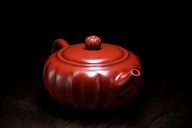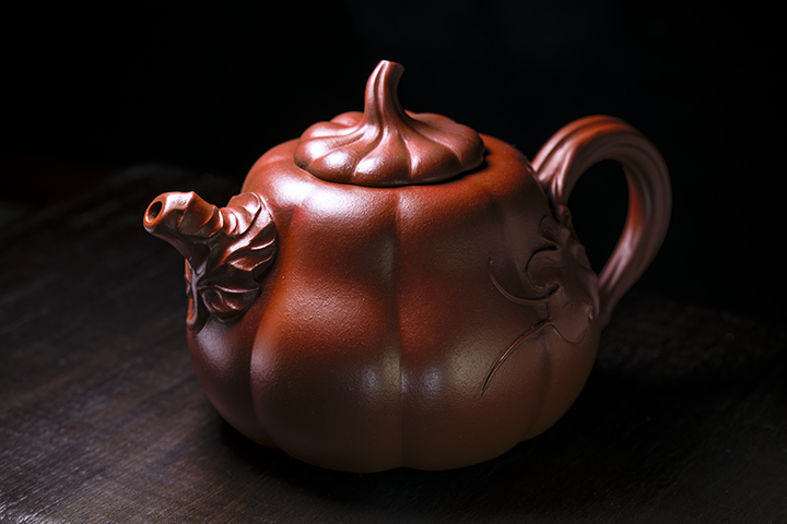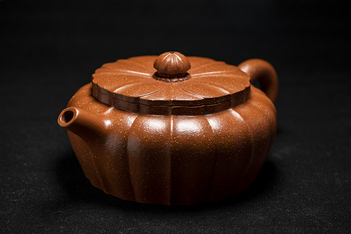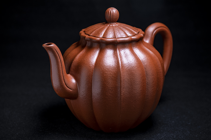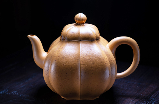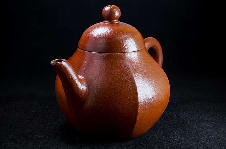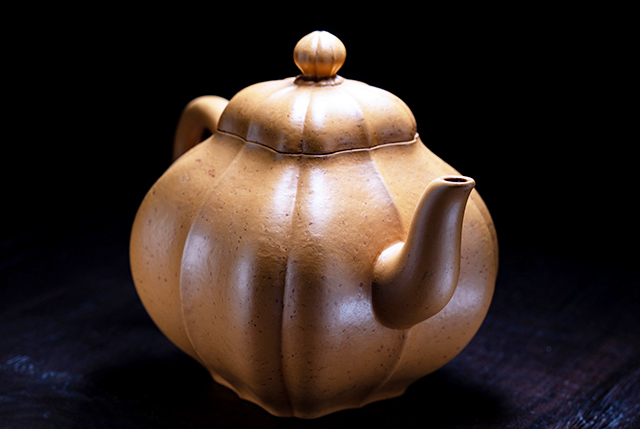 從壺正面可感受動人線條,金澄朱泥在燈光下呈現迷人色澤