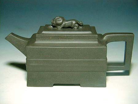 自然光線下其泥色翠里洇紅,點點如秋氣過野,森煞在眼,曠遠而蒼涼;燈下把玩,尚能隱其悲色,一轉端凝若廟堂之鼎,修廓厚質,肅穆其神。置諸眾朱泥圓器中則清駿健拔,一反婉轉曲折之態,倍增雄范。其線走橫直方正,峭陡如崖,層層壘疊而不見繁復。獅形其紐,如踞天元,挾其睥睨捭闔之勢,蓄於將發未發之間;王者之陛臺,益其不怒之威霸。體制雖止230cc,其勢駸駸然竟欲淩駕於三五百毫升之上,細制而大氣,不可謂不奇也。撫之棱嶒在手,平生不可玩褻之冷峻、桀驁未馴之訝異。其質雖非金玉,口蓋開合之間,亦自鏗然作鳴,如商音震起,四野皆緘。幸未來得及衝飲,適茶其甘醴之味未曾得嚐,其用之體尤是了了,誠如此,苟得此一器,竟奪百千器之靡麗,夫復何憾哉!