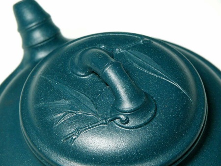 這竹節壺竹枝竹葉處理得典雅清逸,深得板橋三昧,泥色湛藍碧澈,顆粒均勻,印象中嫩蜜松碧還未有過花貨品種啊!