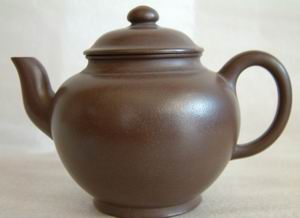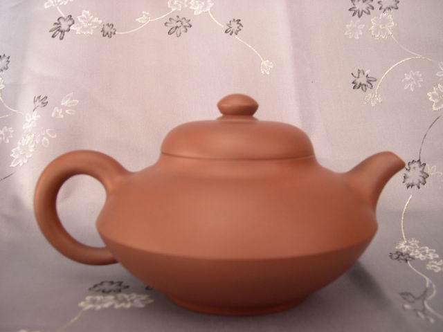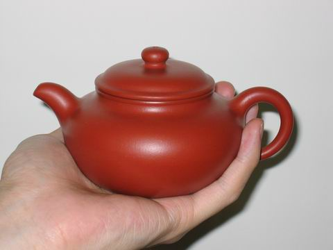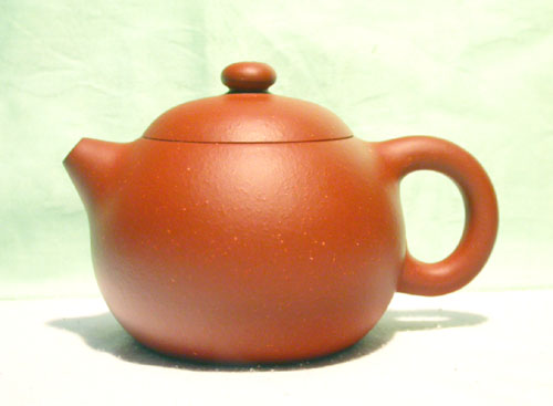 0909:附上該壺的説明文字。】:此“西施”壶为紫砂传统精品朱泥款式,作者选用早期黄龙山特名贵朱泥原矿,手工炼制“细梨皮砂朱泥”(子畦梨皮朱泥)精心制作,是今春的新作。此泥料为仿明末大师陈子畦传器而成,变色率高,泥色纯正,配合壶型形体优美而稳重,容量中品,适于各种茶类泡饮。