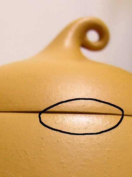 2.跟造型與泥料的特質有關,...這把曹美眉之壺身筒是一個泥片,“豎立”圈起後拍打成身筒,壺頸再黏上一片“橫的泥片”,問題就是出在身筒的泥片是“豎”的,而“壺頸”片子與“蓋面”片子是“橫”的,所以有些泥料就會因泥片的“橫或豎”而形成光線折射有所不同,這在全手工壺上是很正常的現象!