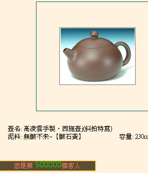 1. 從2003年10月16日(星期四)晚上19:00開始,只要您是【真壺超值VIP會員】,於真壺網站的“首頁”欄左下方,按中第500000的訪客,請務必留下證據,並寄來給真壺,您就可得到圖中這把,由高鳴手製,最難成型、燒成的頂級真壺名泥~嫩大紅袍的作品~~小熊貓茶海!