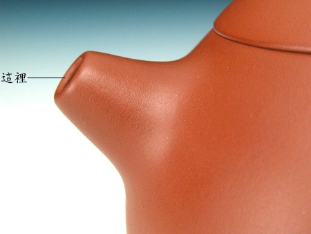 牛蓋洋桶_壺嘴特寫, 壺嘴上縮的過渡絕美,黃色小圈是五色土泡水後的註冊商標~