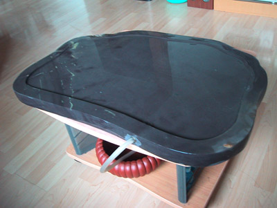 小弟這方端石茶盤 長:70cm 寬:45cm 厚:5cm 是托人找到一塊坑仔石料,按照最大的週長做出來的。當時爲了鋸開這塊石料就花費了5天的時間。高興的是三分之二的面積沒有雜質還帶有黃龍和翡翠斑,遺憾的是沒有凍更沒有青花,最可惜的是有一顆眼長在上面一層,我沒有保留到。