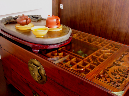 貼上小弟平日品茶時的家當, 圖中茶盤即是梅花坑端石. 是小弟親往肇慶扛回, 足足23公斤.