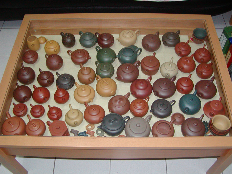 說實在對品茗我沒有那麼敏銳的味覺,我認為只要是不要太差的茶及好的壺我想茶湯的表現應也不至太離譜吧!買了這些壺帶給我最大的樂趣就是可以看心情來決定要用什麼顏色的壺,紅,綠,黃,紫...(當然我並不那麼的在乎較生的茶要用什麼樣的壺或是較熟的茶要用什麼土比較適合之類的..)一次次的看著它們越來越油亮動人說真的不泡茶就光看它們擺在那裡像一件件藝術品也令人心曠神怡,相信真壺大多數的會員都和我一樣的看法吧?