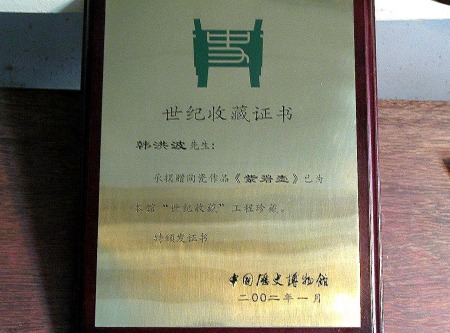 中國國家博物館的世紀收藏證書。(紫碧壺)