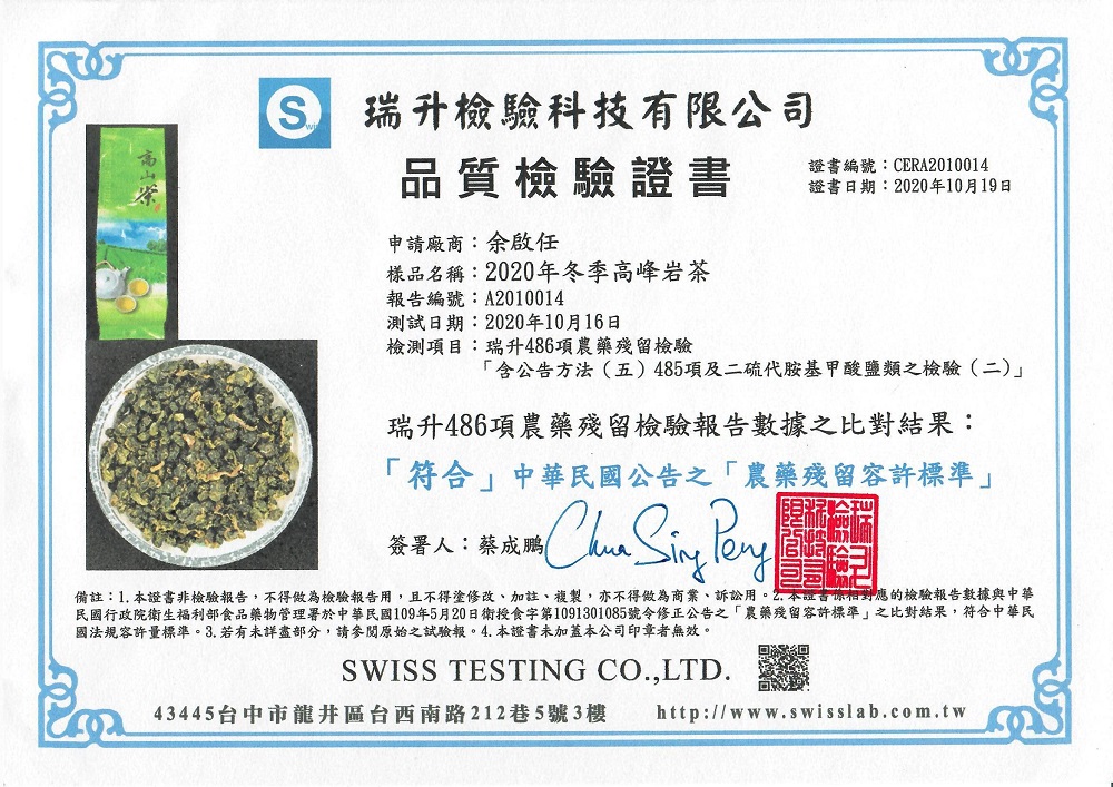 古農真壺依照往例將【2020年冬季高峰岩茶401】送交單位進行農藥殘留檢驗,本次送檢的486個項目,依然如往年一般全數過關!真壺自產自銷的高峰岩茶,讓您可以全家大小都喝得安心、健康、過癮!