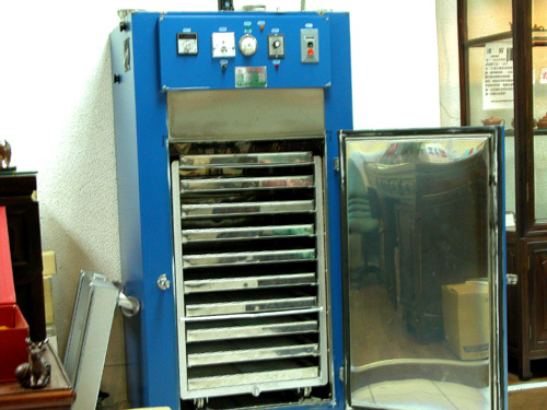 「....所以,茶葉常常都會喝到半年以上,甚至一年以上.......雖然天天喝。為了解決這個困擾,我們是用烤箱乾燥....旋風式烤箱,一般烏龍,70度,兩小時,焙過的烏龍,80度2小時。當茶葉香氣、滋味因退火到達頂點後,會產生一些香氣、滋味的變化,過了一段時間,茶滋味、香氣開始退的時候,就是產生過度氧化的時候,這時,就該烤了,如果只用70度,香氣滋味不會產生太大的變異,請放心....多年經驗。」