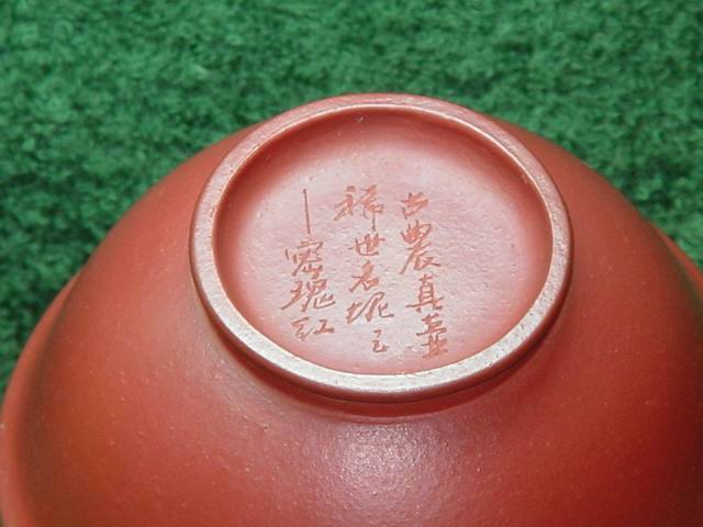 藍子兄的藏寶樓才是真正的後宮,佳麗何止三千?連我等認爲至愛的蜜瑰紅都輪不上泡一泡,唉真是》》》》》想必大紅袍鳴遠四方壺也可能未用過吧?!(我的眼紅得象兔子眼了)321兄何煩:1以後只買(嫩)蜜瑰紅就可;2與他打賭,化料是不可能有養成換檔的變化的,刷掉重養一遍(反正快麻);3不用她時作茶海也可。再來一張蜜瑰紅作品:茶碗。字不錯吧?