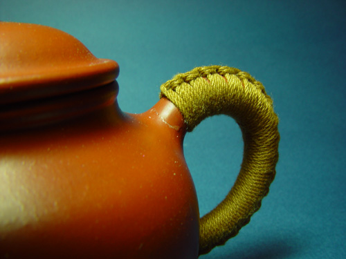這把壺是我心中永遠的痛. 記得壺入手不久後現寶給朋友看. 一不小心壺從友手中滑落, 壺把斷成三節. 下張圖片可見壺把截斷處. 後經阿毅以膠黏合及余太巧手纏線, 勉強維持外觀完整. 但在也不敢沖泡, 一直供奉收藏櫃中. 此壺的泥質與小匏瓜一般屬回練較少, 很 "優" 唉! 痛! 痛! 痛!