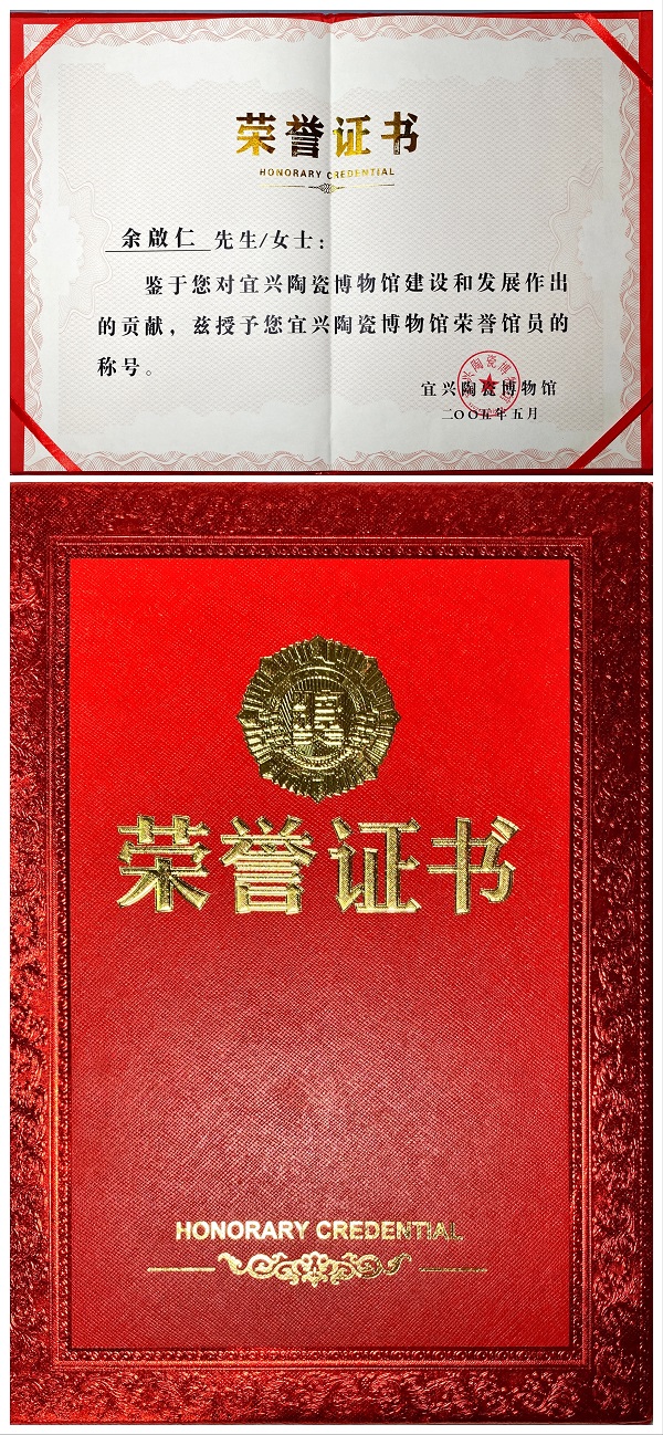 中國宜興陶瓷博物館所授予的"榮譽館員"證書