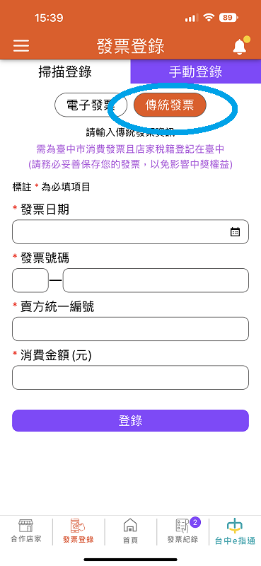 步驟5:點擊"傳統發票"按鈕,然後輸入您發票上的日期、發票號碼、真壺的統編"16880234"、及發票上的消費金額,系統即會自動辨認真壺為優惠店家,抽獎次數加碼為三倍喔!