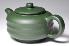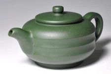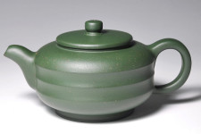 在胎表的改進上,刻意以極稀的紅、黃大砂粒點滴疏鬆的點綴於壺表上,似初雪落綠葉,具悠然神往之趣,免除了前代滴翠的單調色調,與平淡的養成效果!