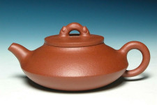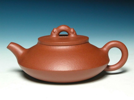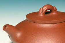 在沉重似鐵的頂級朱泥~【飛雪朱砂】為胚下,吳婷婷助理工藝美術師設計以上寬下窄上下相合應,近似合歡壺般的身筒,配合直上略曲,出水暢快的短壺嘴與玲瓏富張力的壺把,襯托出視覺焦點的平整蓋面,並以似抽象龍形如意圖騰為橋鈕,創出了觀賞實用兩相宜的藝術佳作!