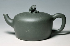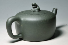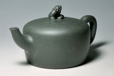 本作品乃工藝美術師高峰老師1990年代於古農真壺旗下承包時所創作,作者高峰工藝師以龍生九子之~【螭吻】形象為壺鈕,搭配極為光素古雅的壺身與簡練的線條,採圓潤的卡蓋手法創作,更凸顯出壺鈕之幽雅視覺效果;壺底圈足特意造出一小圈圓潤的凹線過渡,也間接展現出作者的過人製壺工藝與藝術內涵,誠為高峰老師創作的頂級作品之一也!