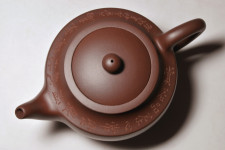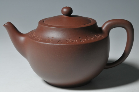 本作品以上凹肩線的圓弧缺口,對應出略三彎的曲流和高把,蓋面微聳,採卡蓋處理製作,壺肩稍平處由吳貞裕工藝師以詩詞裝飾雕刻,更顯文學與藝術的絕佳配合,乃沖茗玩賞之利器也!