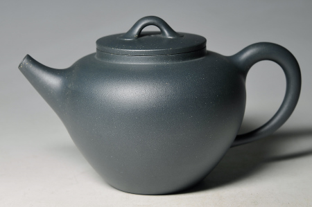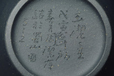 【本作品所採用的的天青泥,為古農真壺調砂名泥之一,壺表金砂星斑美不勝收,尤以此壺不僅壺底由吳貞裕老師精心鐫字:“玉潔壺‧戊寅年初春月周潔萍造於蜀山‧周‧3-2”;巧合的是這僅造三件中的第二件,其壺嘴上方中央恰有一金點躍然胎表(由斜拍鳥瞰圖中即可看出壺嘴上的金砂),更使本壺形成巧奪天工的自然特徵也】