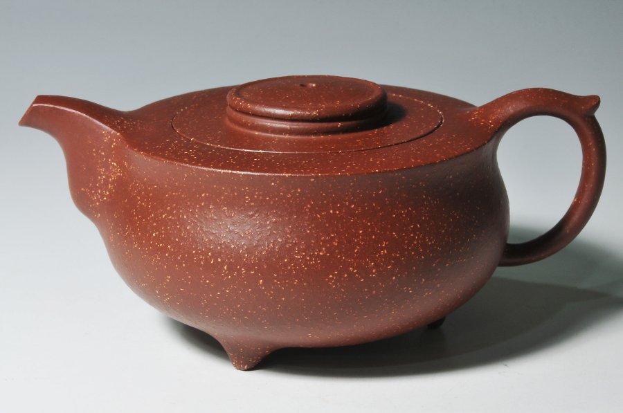 壺體線條圓潤渾厚,三足鼎立,穩若山岳;自底向上,宛如古鼎之腹,載著天地間沉積百年的華章。壺蓋與壺肩一體而平,宛若古器之蓋,精準嚴謹;壺嘴與壺把兩側對稱開展,恰似古代祭祀器具的對仗結構,儀態間見威儀。