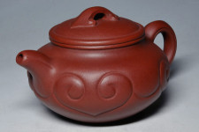 細細品鑑此作品,能輕易的讓人感受到十分難能可貴的英爽秀麗、莊嚴成熟的特異風格,賦予傳統作品嶄新的生命與更完美的詮釋;如意型壺鈕厚實而豪放,壺身筒之如意圖騰凹凸有致、筋紋處的精加工柔順而自然…,壺身下部收斂較大與高祧,壺頸與壺口的過渡與口蓋寬度也做了適當的調整與變動,嘴與把的銜接角度和老練,使作品輕易的散發出瀟洒脫俗的俊逸氣質,這種過人的加工手法,加上高貴而不貴的低價,實為物超所值的最高呈現!