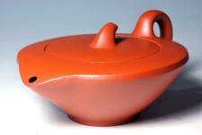 【穹天系列】~飛天壺s,以遨翔天際、氣勢磅礡的大鵬鳥為創作主題,大膽前折的壺嘴,輕易點出了大鵬鳥的傲然之氣與鵬啄之形象,肩身轉折處以快意切削的“平寬線面”手法處理為過渡,更是讓老麻瓜折服神來之筆,蓋除了彰顯出作者的自信心與寬大胸襟外,持壺轉動,該過渡處的“平寬線面”竟隨著光線而俐落的閃動,直似大鳥飛翔天際時的速度感,亦似時光之流轉不息…。