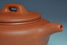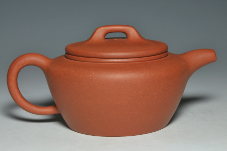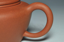 寬廣而開闊的壺口蓋,使置掏茶時十分便利,橋鈕以渾方角的剛毅方式呈現,蓋沿厚度略大於壺口圈子的厚度,使作品有沉穩莊重之感,配上微彎而流暢直率的明式最風行之壺嘴形式,及把內略平的壺把,也確保了持拿時的穩定性,和採用較難製作的內包式圈足,使作品散發出作者內斂而不取巧的特殊性格,可真是壺如其人呀!