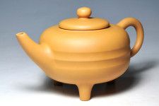 三足鼎力之勢,將壺體襯托出蕩漾動感的視覺感受,更添“清波漣漪”之感…,作品以上衝有力的壺嘴造型,呼應出壺把的婉轉簡約,剛柔相濟,實美不勝收至極…;蓋面以較為輕盈的儀態,輕閤身筒上方,恰當而完美的融入了整體的氛圍,使本作的低調奢華之風表露無遺,直讓人百看不厭,愛不釋手矣…。