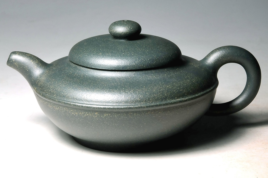 古農真壺這次特地採用茶湯十分清甜、甘美的稀世名泥~【老豆碧】為胚來創作新品,在海藍中泛出綠意的胎色中,這位古農真壺陶藝高手打出寬而略扁的潤和身筒,腰身裝飾一凸線泥條,頓使作品充滿生命力與巧妙之感,順勢拉起的壺嘴線條,和圓潤富張力的壺把過渡與曲線,襯托出作品的勻稱之美感!