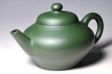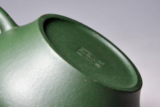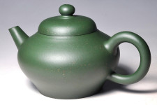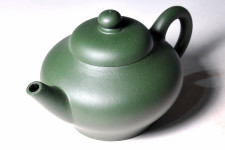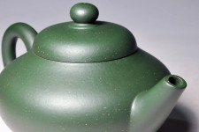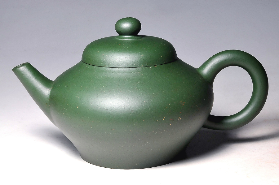 在胎表的改進上,刻意以極稀的紅、黃大砂粒點滴疏鬆的點綴於壺表上,似初雪落綠葉,具悠然神往之趣,免除了前代滴翠的單調色調,與平淡的養成效果!