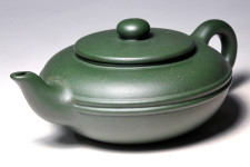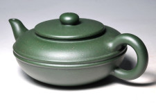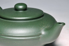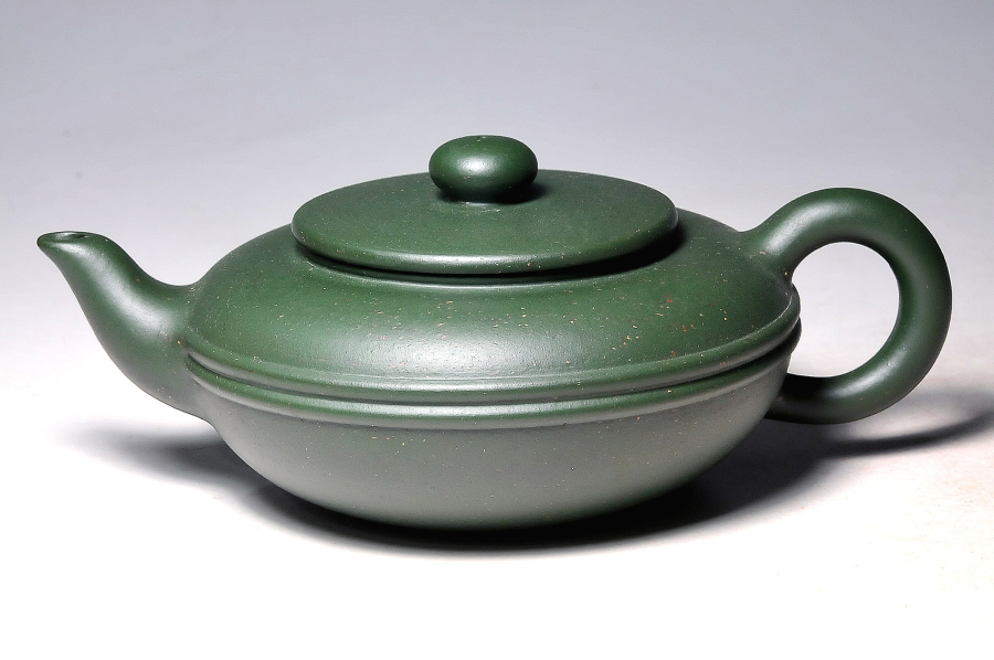 在胎表的改進上,刻意以極稀的紅、黃大砂粒點滴疏鬆的點綴於壺表上,似初雪落綠葉,具悠然神往之趣,免除了前代滴翠的單調色調,與平淡的養成效果!