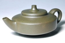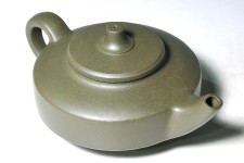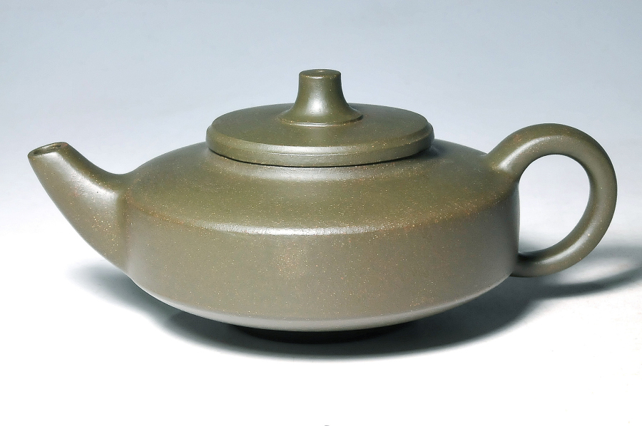 蓋沿造出凹線小過渡,配合鈕座的明線,與聳立而起的壺鈕,使寬扁的壺身與大塊面的留白,頓時生動豐富了起來,…也創造出作品無限的生命力與美感;上揚的渾角長式壺流形式,巧妙的呼應了渾角有勁的壺把,完成了一件完美的傳世級佳品!