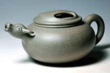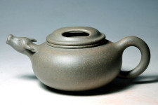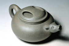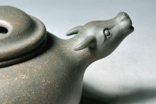 真是一件頗具親和力的好作品…,在渾圓略扁的身筒上,配上一個栩栩如生的牛首為壺流,茶湯即由微張成圓的牛嘴中傾注而出,充滿泡茶時的趣味性,更有意思的是,更將身筒上的壺蓋打造成“牛蓋”的形式,藉以搭配 “牛”的創作主題…,真可謂:理、意、趣兼具矣。
