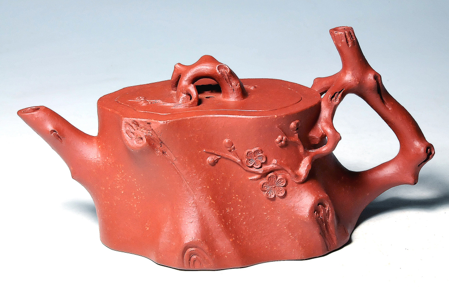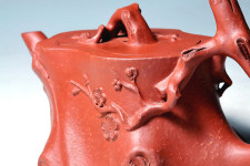 古農真壺稀世名泥~【朱瑩】在梅幹留白處隱隱散發出包漿剔透的潤澤美感,清麗的梅幹身筒與蓋面,綻放著生意盎然的梅花與花苞…,筆直而富生氣的梅枝壺嘴,很自然的從梅幹身筒處長了出來,勁道的崢嶸梅枝壺把,天然的長出了極高而特殊的飛扣,及適手而富天然奧妙神奇的大自然植物的生命力!
