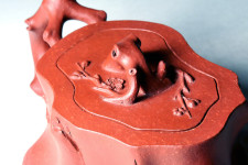 【朱瑩】於燒成後,胎表呈現出深沉而略泛紫光的朱紅色(乃有深度的暗紅色,真是紅豔已極,早已紅得發紫矣...),並有富含岩片狀的特有胎表,以手觸撫胎表似有Q軟之感(有此Q軟觸感者,必屬奇泥級名泥也!),胎表質感晶瑩剔透(泥質胎表的穿透感絕佳),真乃視覺效果一流的稀世美泥也...。