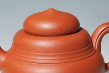 很有趣而美好的壺蓋,很獨特的成為整件作品的視覺焦點,蓋內周偉君老師打造成雙層結構,配上壺鈕旁的雙圈印記暗號,看起來很豐富而有目不暇給之感,身筒造型形似葫蘆或南瓜,腰身裝飾兩圈精緻的雙線,短三彎壺嘴,配上很雄奇的飛扣,很有型,也讓作品更有看頭!